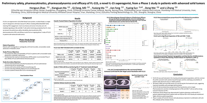 首发管线FL115是白介素-15(IL-15)的超级激动剂,可激活自然杀伤细胞(NK细胞)和特定的记忆性T细胞亚群,和现有的T细胞主导的免疫疗法(如 PD-1 抑制剂)具有互补协同作用。FL115多个临床试验正在中美进行,在晚期实体瘤患者I期临床中单药展现了良好的安全性以及初步临床疗效,是唯一在此人群中单药获得部分缓解(PR)的IL-15超级激动剂,具有全球“同类最佳”潜力,正在进入PD-1单抗联用试验阶段。在非肌层浸润性膀胱癌患者I期临床中单药及BCG联用展现了良好的安全性以及初步临床疗效,正在进入临床II期阶段。